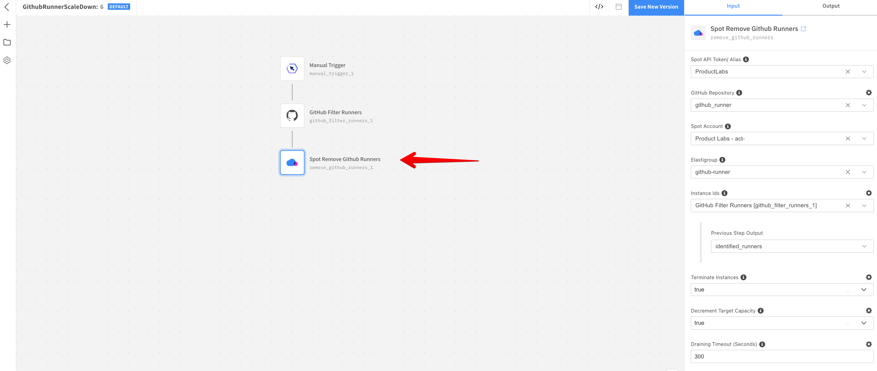 Configure the Spot Remove GitHub Runners resource, by selecting Spot Instance configured in Step 1 as Spot API Token. Select the GitHub Repository configured in Step 2 and the Spot Account and Elastigroup Id you created in Step 4.
