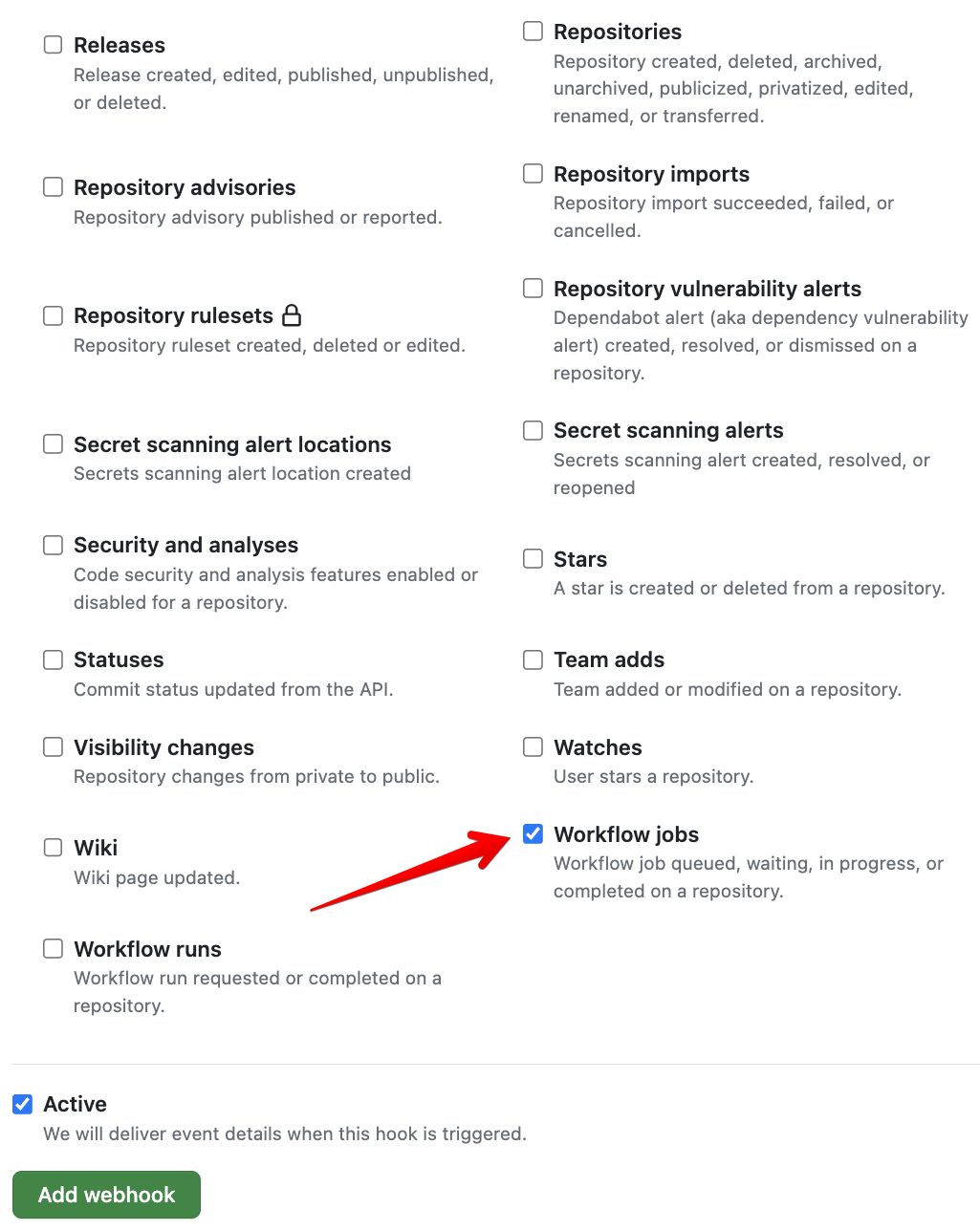 Complete the GitHub Webhook setup by Marking Workflow Jobs to trigger the webhook for workflow jobs events.